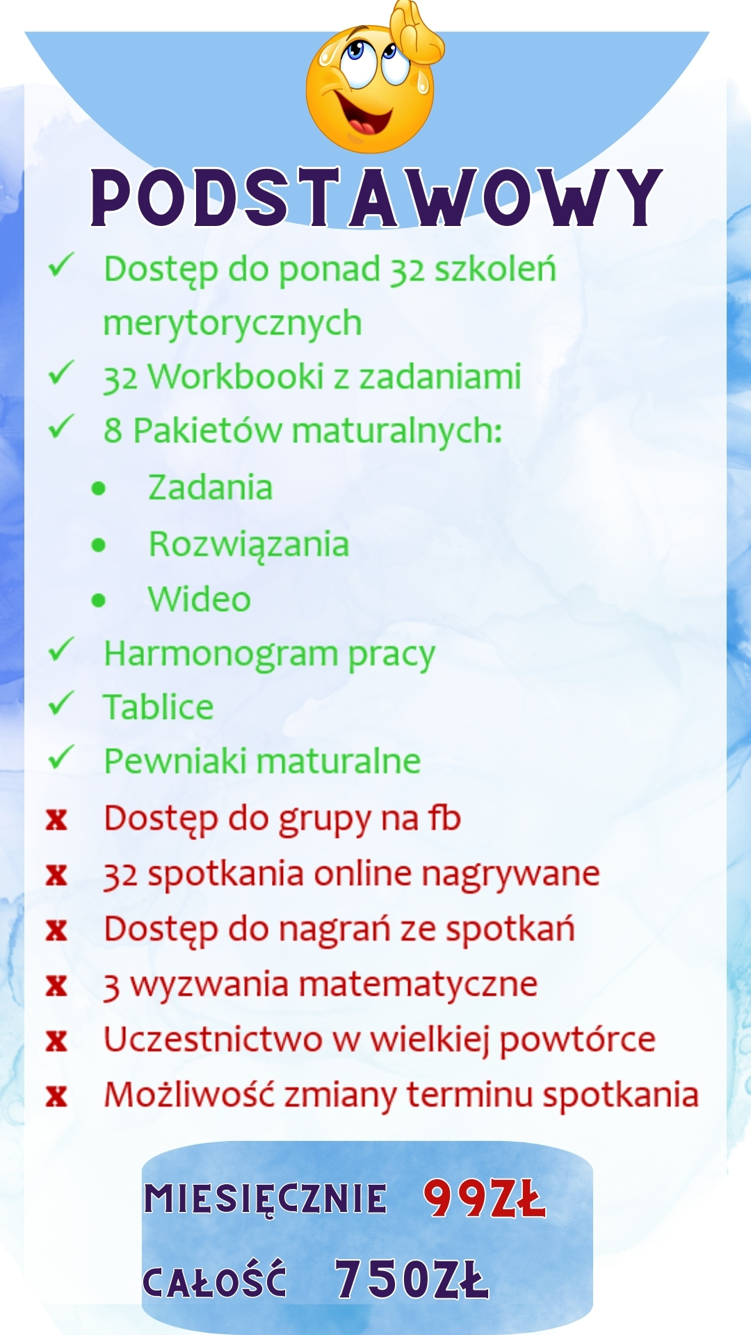Co miesięczne spotkania maturalne na żywo to okazja, aby wspólnie rozwiązywać zadania maturalne i omawiać różne strategie ich rozwiązywania. Spotkania odbywają się na Zoomie, a link do nich otrzymasz wcześniej. To doskonała okazja, by przygotować się do egzaminu i na bieżąco rozwiązywać trudności.