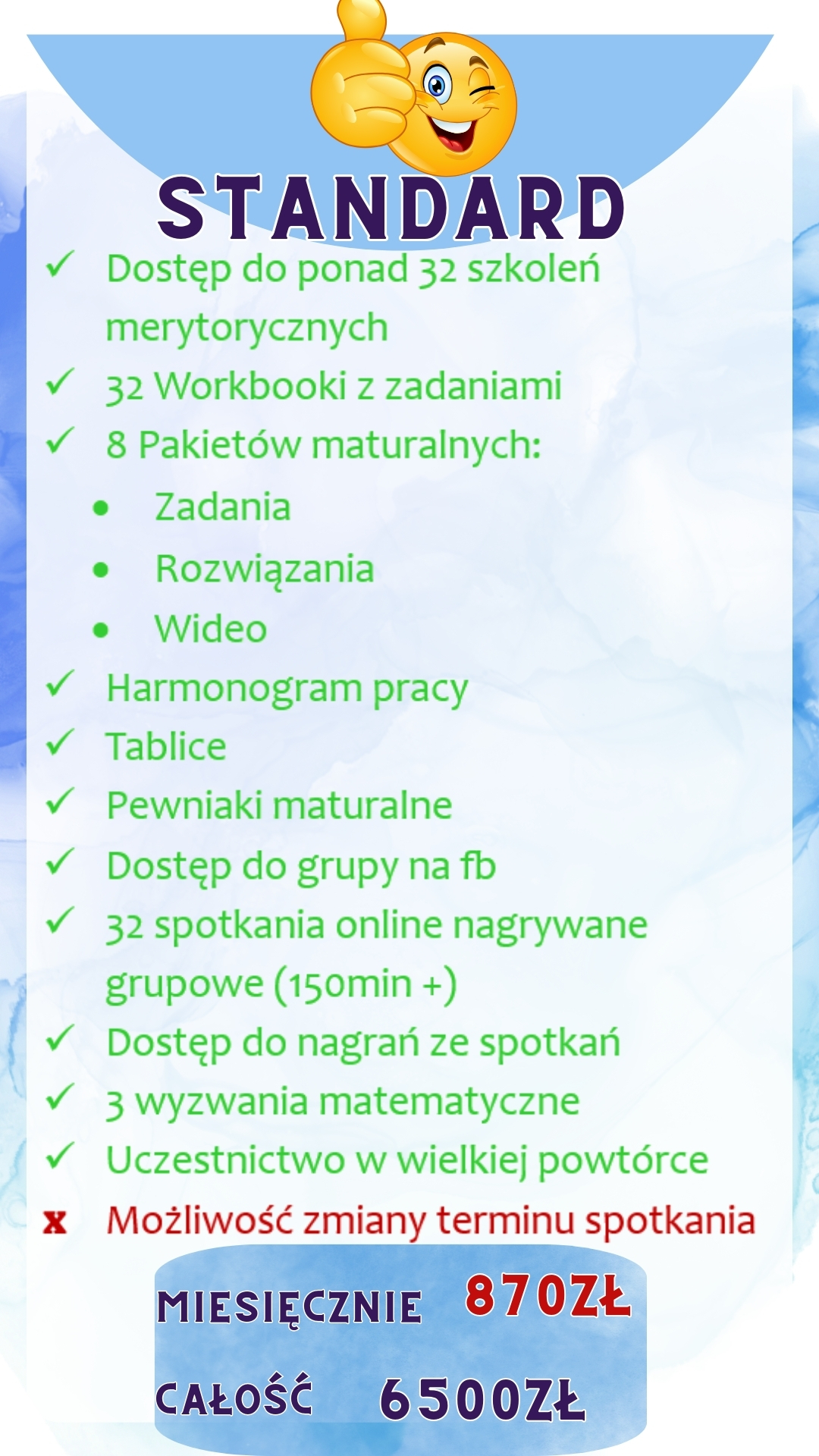 Wielka powtórka to 3 spotkania na których analizujemy całe arkusze maturalne. Od spotkań różni się przede wszystkim tym, że nie analizujemy konkretnego działu, lecz cały arkusz maturalny. Dodajemy sobie techniki pracy nad całym arkusze, pokazuje techniki oszczędzania czasu oraz sprytne sposoby jak walczyć ze stresem, gdy w pierwszym momencie nie zrozumiesz co oni w tym zadania chcą od Ciebie.