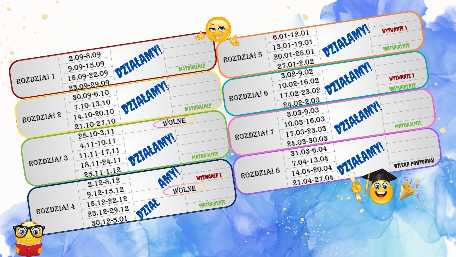 Każdy nauczyciel dopiera tematy pod siebie i w kolejności jaka jest dla niego wygodna, ale nie zostaniesz z tym sam zawsze będziesz mógł zajrzeć do działu który Cię aktualnie interesuje!